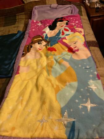 Girls sleeping bag. I used this for my granddaughter between the ages of 5 and 10. Snow White, Belle and Cinderella figures on bag. Has a separate area for pillow. Includes a pillow and pillowcase....