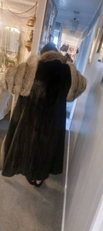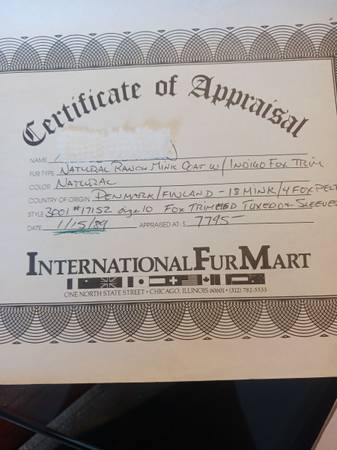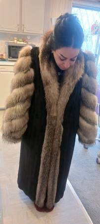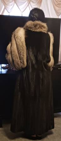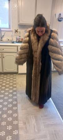 Natural Ranch mint coat with Indigo Fox tuxedo trim and collar. Like new excellent condition and lining also excellent condition. If interested Exchange at the Inkster police station, cash money.