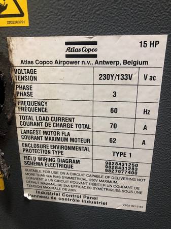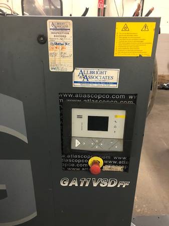 Nice Atlas screw type 15 HP air compressor. Model Atlas Copco GA11VSD FF, Includes a Integrated refrigerated dryer. Located in Livonia Michigan. Price $6900