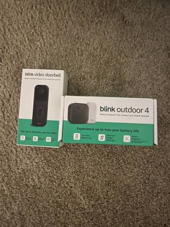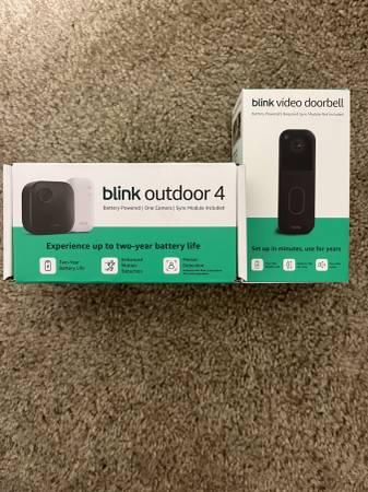 new in box newest model blink doorbell camera - white or black - retails $60 newest model outdoor 4 security camera - 1 camera system - retails $80 together for $90, I have 2 kits in black and 1 in...