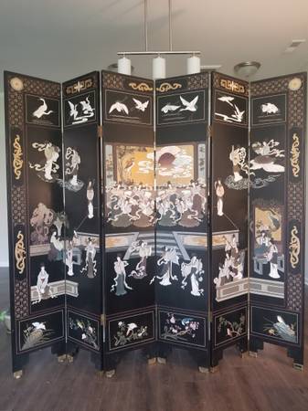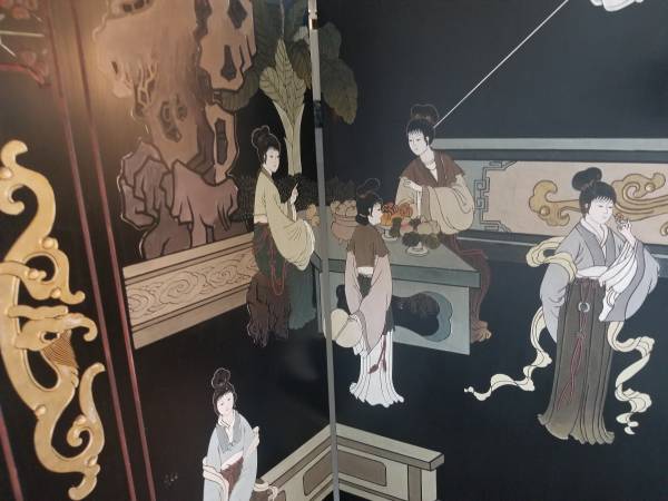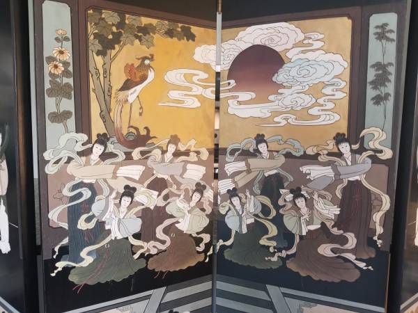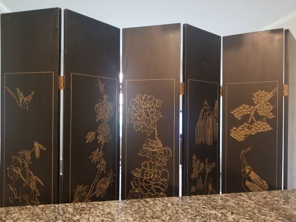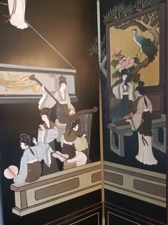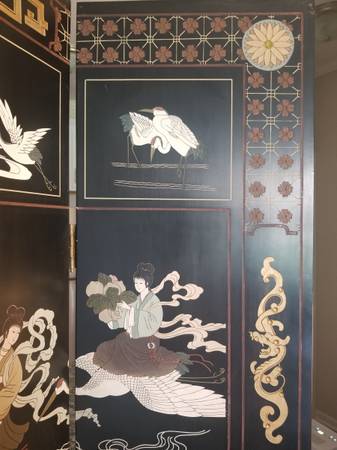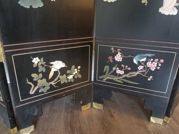 This asian panel was brought to America in the 1970s by a man who had been stationed in Japan so the age is at least 50 years. The panels and hinges are in very good condition. On one side (the non-color engraved/etched side) is a faint number toward the top of one panel in white (crayon). It will probably come off but I didn't want to risk damaging it.