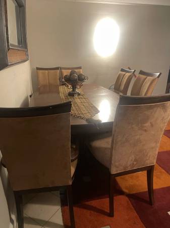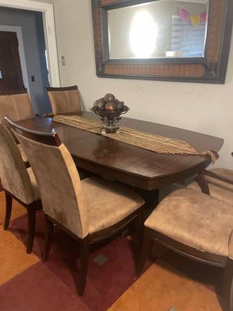 Used high quality dining set (table and six chairs), large dark bamboo look wall mirror and large high quality area rug from Bombay store. Pick up only.