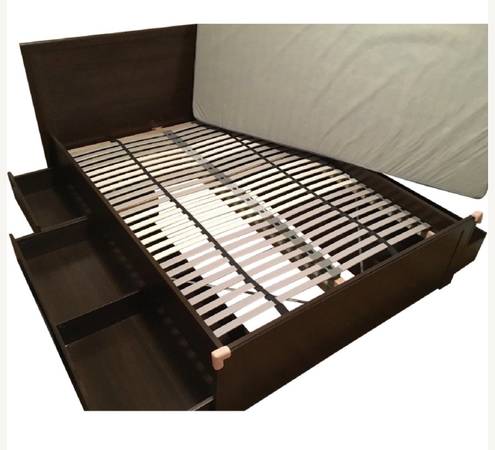 IKEA Brusali Dark Brown Wood Queen Bed With Drawers great condition. Mattress is not included. $500 plus tax at IKEA. Frame rails, headboard, footboard, base and 2 large rolling drawers