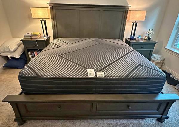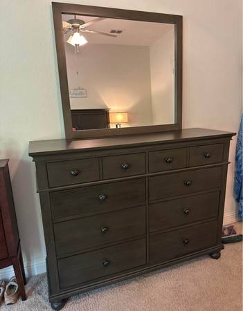 Only 1 year old in excellent condition. Mattress is in excellent condition too. 2 night stands, 8 drawer tall dresser (top left side for jewelry) with mirror & TV bracket (attaches to back if you want to use mirror elsewhere), 5 drawer dresser with pull out wooden rods on each side - will throw in lamps when purchasing everything!