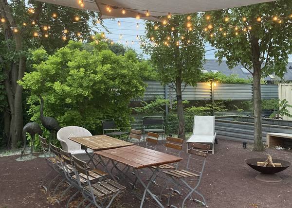Outdoor Patio Garden Table (Qty 2) and Chairs (Qty 8) heavy steel frames and wood - purchased from Meantime on Cass Ave (formerly 8 Degrees Plato)