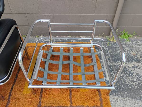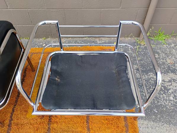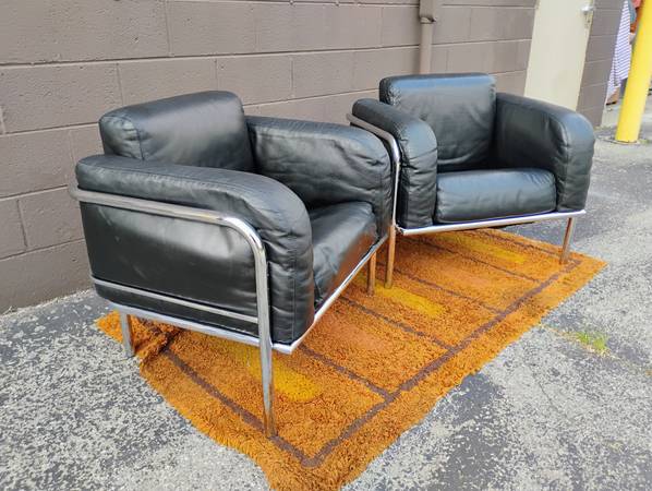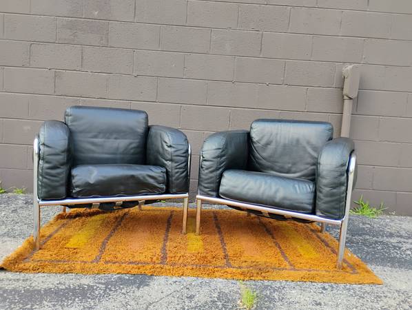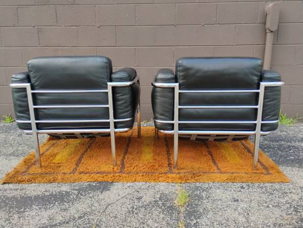 Pair of Vintage Le Courbusier Style Lounge Chairs Black leather, chrome tubular frames 30h 33.5w 28d 16 f to s 16 f to b Rug is NFS We don't text any numbers use any codes accept checks give out our...