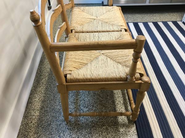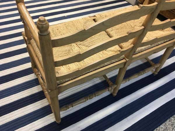Ladder back rush seat settee/bench. In good condition with no damage or repairs from non smoking household. Sturdy to hold adults and perfect for entry way or hallway to sit while taking shoes on...