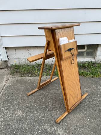 For sale is a 36" tall portable oak podium or auctioneer stand with a ballot box. This stand can be adjusted to a number of heights and folded up for transport. It is made of oak. It has a bid box with a smooth top that flips up for removal, a space for documents on the side and an attached pen. This was previously used to conduct auctions.