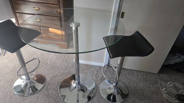 Table Hight 36 inch, and glass top 36-inch round, 2 black and chrome Chairs 27 inch high. or best
