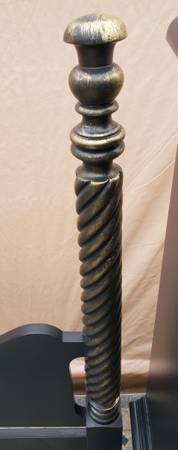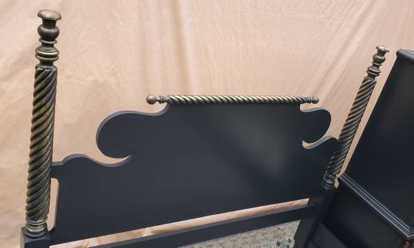 This bedroom set has a fresh coat of Benjamin Moore's Black Satin Finish with Gold Highlights. The Bed features a large rope design and the 5 drawer dresser has plenty of space for your wardrobe. The traditional night stand can hold your favorite lamp or can hold a TV as well.