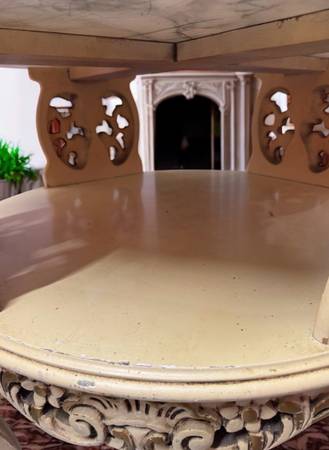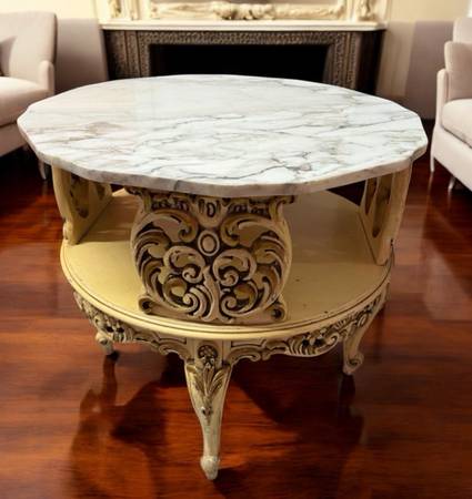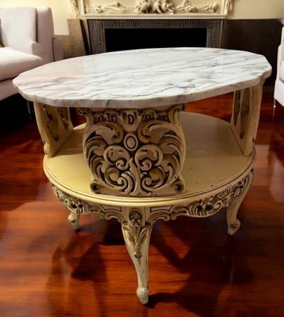 This is a vintage Italian Provincial side table with a marble top and some really detailed carving on the wood. It's got a two-tier design and definitely has that old-school charm.