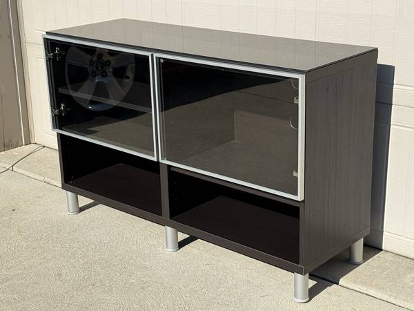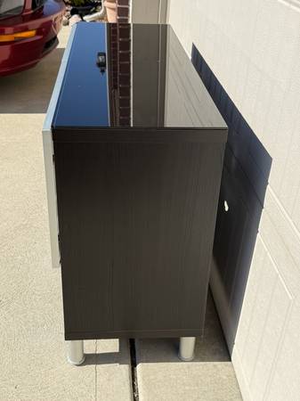 IKEA Besta TV Stand / Media Cabinet / Gaming Center! This cabinet has a great-looking, modern design and a dark gray/black finish. It features center-opening glass doors that opens to multiple, adjustable shelves. It has a black glass top and silver legs. This cabinet can be used with all of your entertainment systems, gaming systems, and electronics. It is in very good condition with only minor wear on the finish (please see pics). This cabinet measures about 47.25" wide, 29.25" tall, and 16.55" deep.