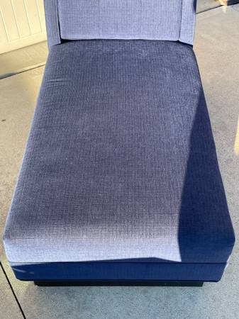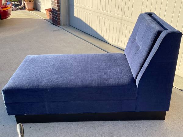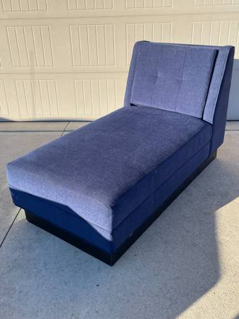 Blue Chaise Lounge - very comfortable sofa with a great modern design! This couch has blue upholstery and a solid wood frame; it is in good condition with only minor surface wear (please see pics). This chaise measures about 59.5" long and 30.5" wide.