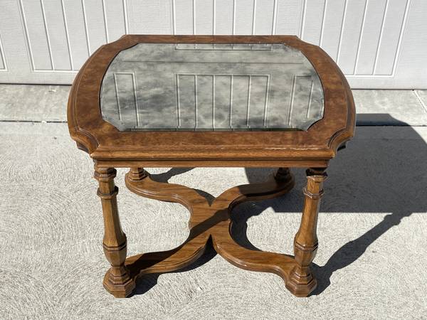 Mid-Century End Table with Mirror Top - made in 1977 by Thomasville! This vintage piece has a great-looking design that includes a burled wood frame and a smoked glass, mirror top. It is solid wood and well made and is in good condition with only minor wear on the finish. This vintage table measures about 28.5" x 24" and is about 22.5" tall.