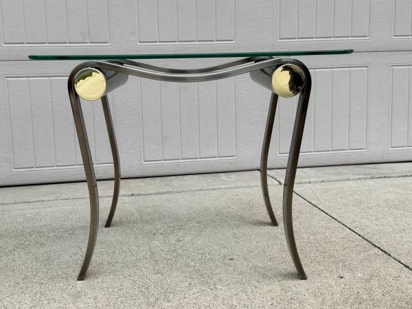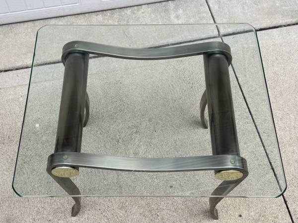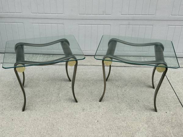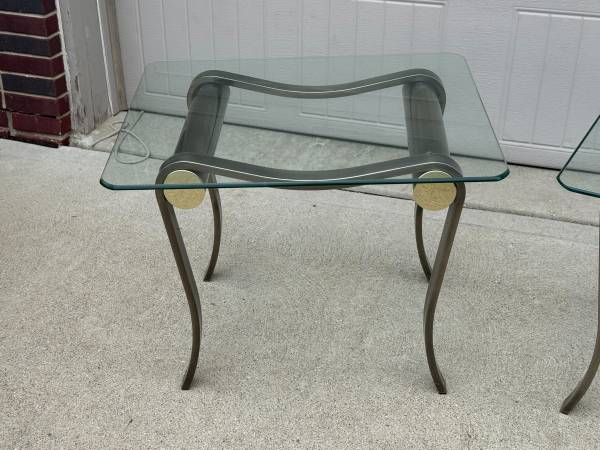 Modern Pair of Brushed Nickel and Glass End Tables! These great-looking tables could be used as lamp stands, end tables, or side tables in a variety of spaces and room configurations. Both have curved metal frames with a brushed nickel finish; they have a stylish glass top for a very modern appearance. They are in very good condition with little or no wear. These tables measure about 28" x 23" and 22" tall. Price includes both tables.