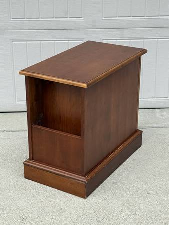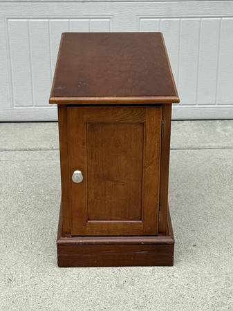 Contemporary Nightstand with large cabinet! This table has a great design and a wood finish. It has a large cabinet for plenty of storage, and it has a magazine/book slot on the back side. This stand could be used as an end table, lamp stand, side table, nightstand, or more. This piece is in good condition with some wear on the finish (please see pics). It measures about 22" tall, 14" wide, and 24.75" deep.