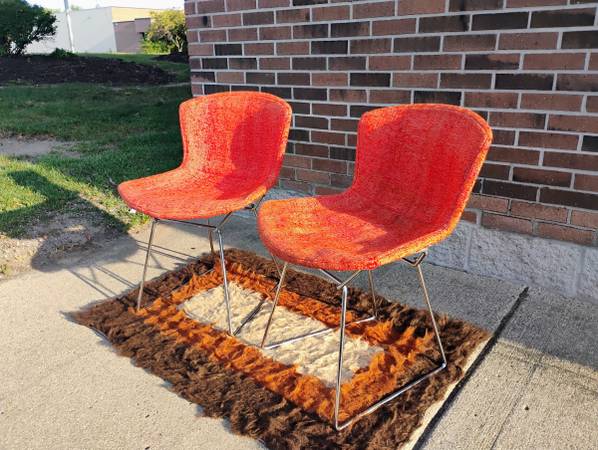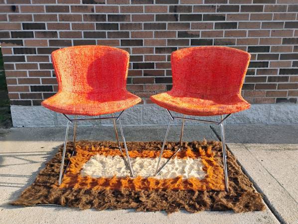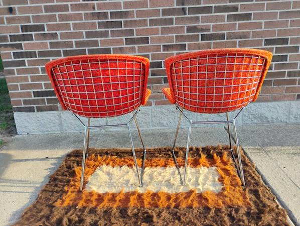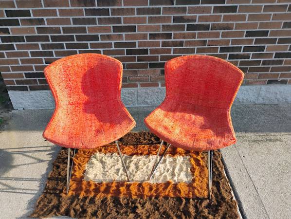 Pair of Early Harry Bertoia for Knoll Lounge or Dining Chairs Marked 30h 21w 24d 19 f to s 16 f to b Color: orange tweed covers with chrome wire We don't text any numbers use any codes accept checks...