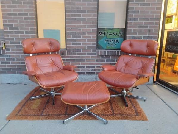 Set of Vintage Italian Made Eames Style Lounge Chairs. Includes pair of chairs and ottoman Recommend recovering Ottoman: 15h 23w 20d Chairs: 39h 34w 32d 17 f to s 19 f to b We don't text any numbers...