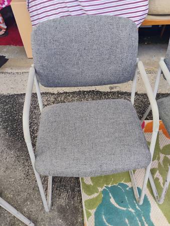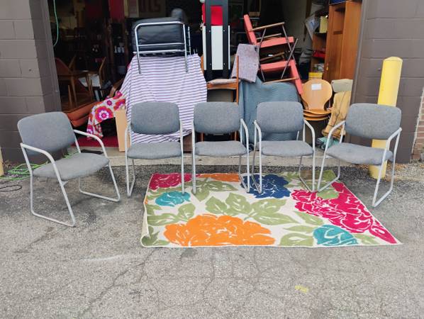 Set of 5 Office Meeting Chairs Waiting Room Chairs Grey No rips Some paint wear on metal frames 32h 32w 2$d 16 f to s 16 f to b We don't text any numbers use any codes accept checks give out our...