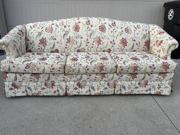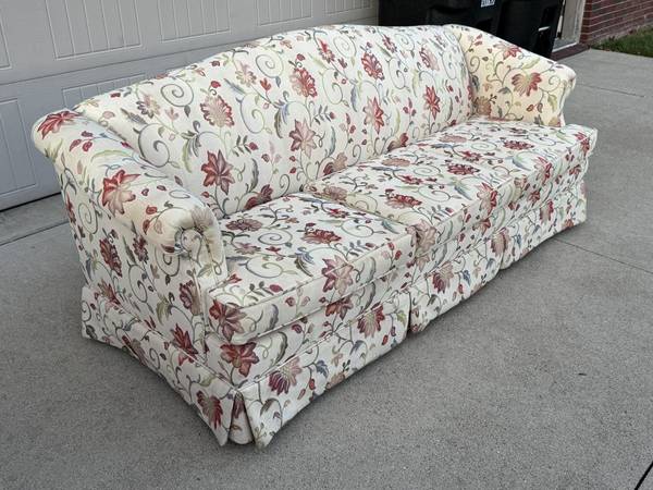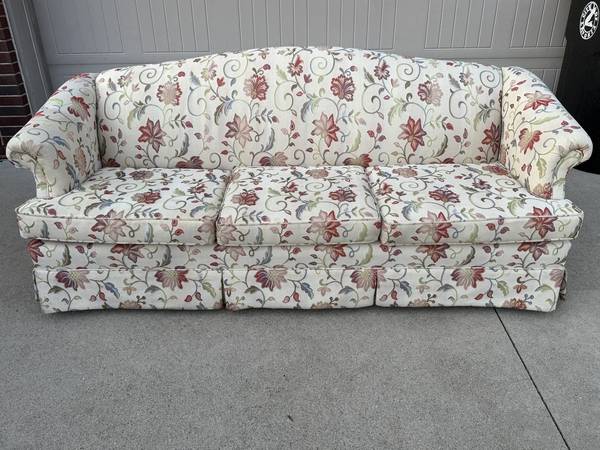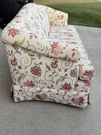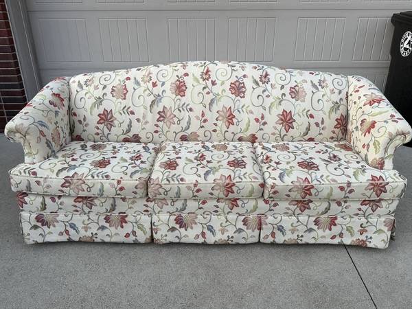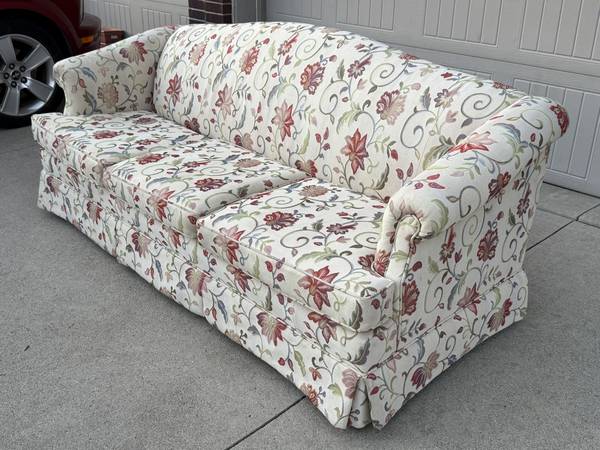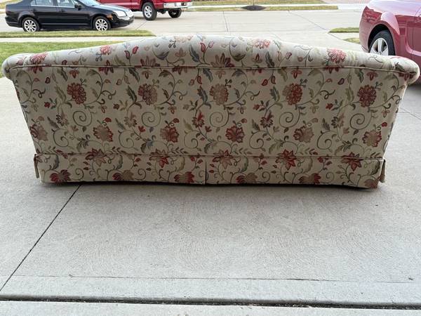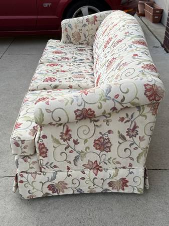 Sofa with Floral Upholstery - very comfortable couch! This couch is in good overall condition and is comfortable. The upholstery is intact and has been recently steam-cleaned (please see pics). It measures about 6.5'-7' wide, so you will need to bring a large vehicle to pick up.