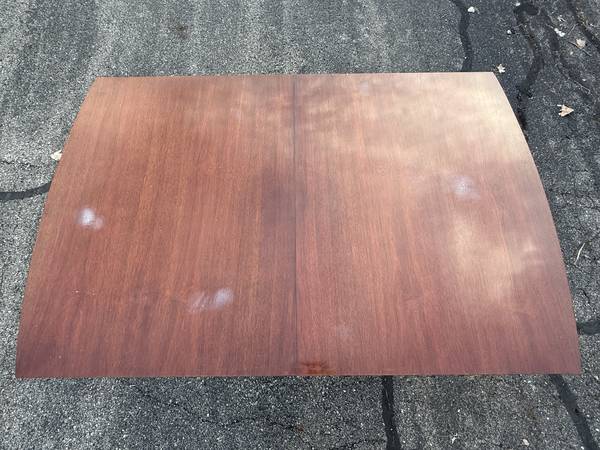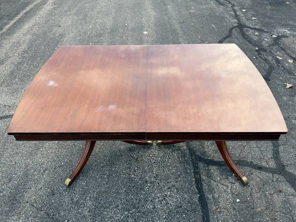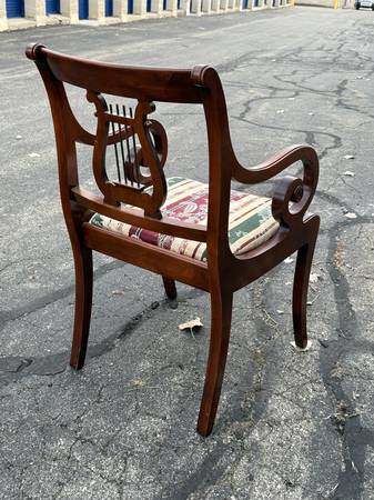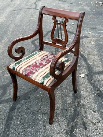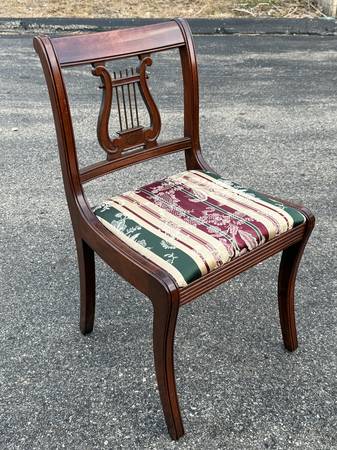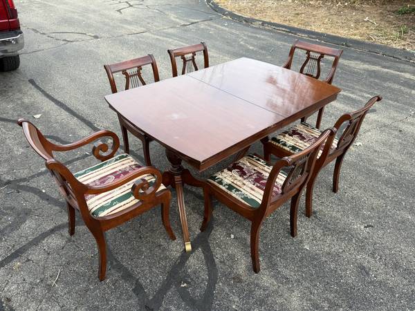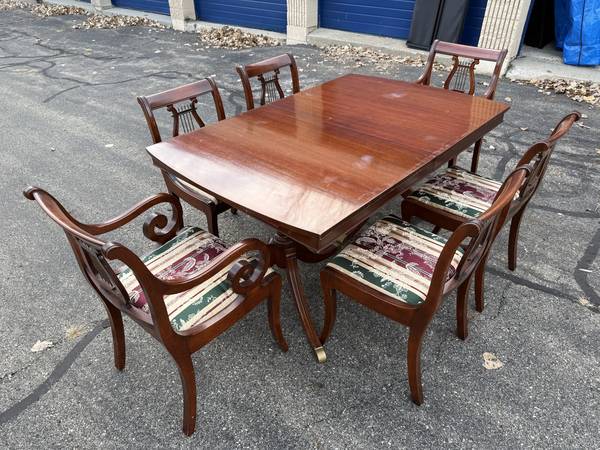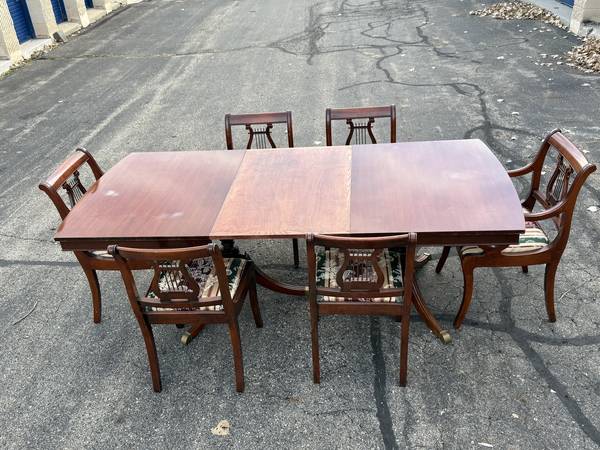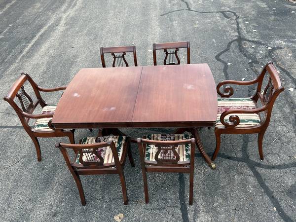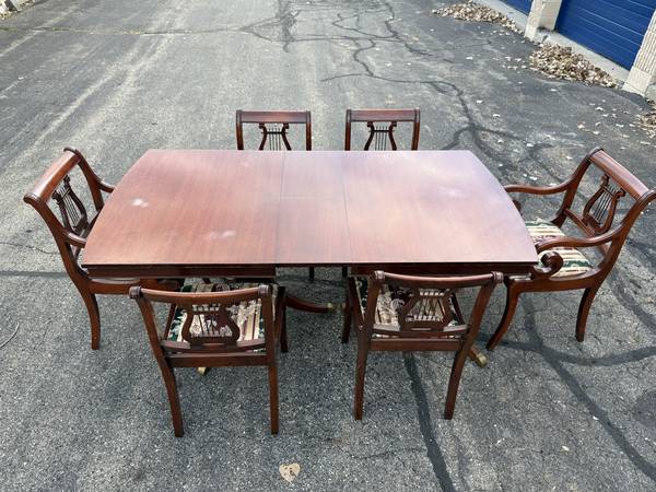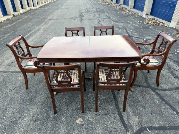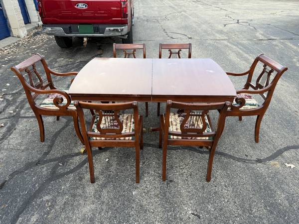 Vintage Duncan Phyfe Dining Room Table with six chairs! This great-looking, Duncan Phyfe-style table is solid cherry wood and is well built and solid. It comes with six matching, harp-back chairs - two arm chairs and four side chairs. This versatile table comes with two leaves, so it can be expanded for entertaining, dining, or many other uses without taking up a lot of space. It measures about 61.75" wide with no leaves, 40" across, and 30.5" tall. This table comes with a hidden leaf that folds up below the table top, which expands the width to about 73.5". It also comes with a larger (non-matching) leaf that expands the width to about 87" wide. This table has a beautiful cherry finish with some minor wear; there are a few spots on the top where the finish looks white (likely caused by setting something hot on it). The seats are in very nice condition, and the upholstery looks good (see pics).