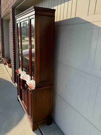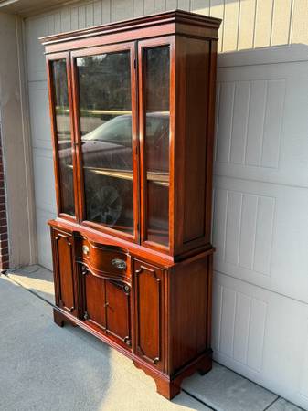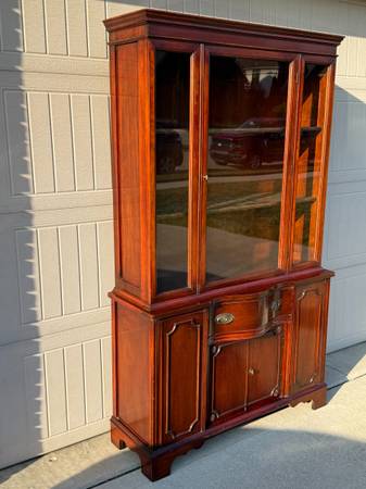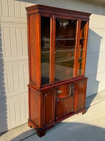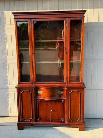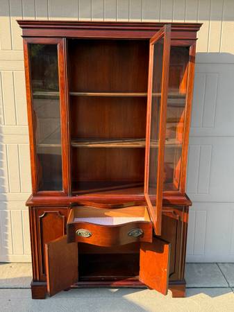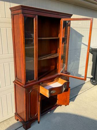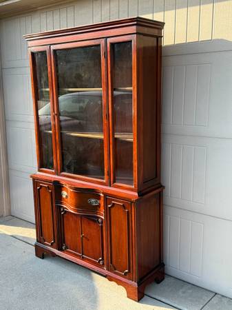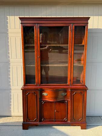 This vintage china cabinet has a great-looking Duncan Phyfe style and serpentine design! This cabinet has a rich mahogany finish and and fantastic millwork. It has center-opening glass doors and three shelves for displaying pieces. This hutch has a large cabinet at the bottom for storing larger items. The drawer is dovetailed-notched and includes the original brass handles/pulls. This piece is very well made and is in good condition with only minor wear on the finish (see pics). It measures about 70.5" tall, 42" wide, and 14" deep.