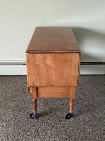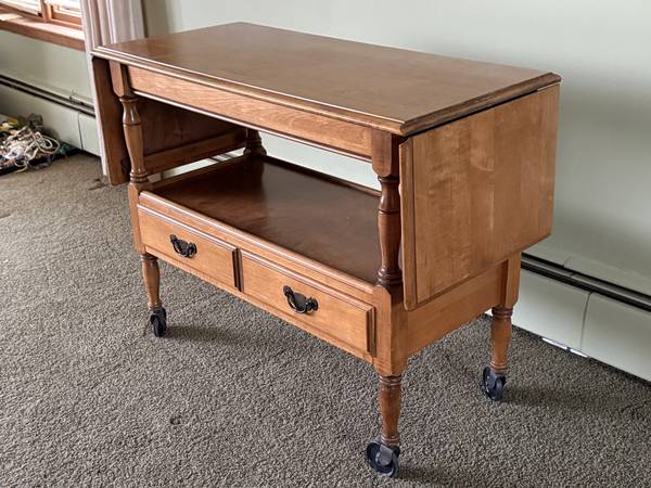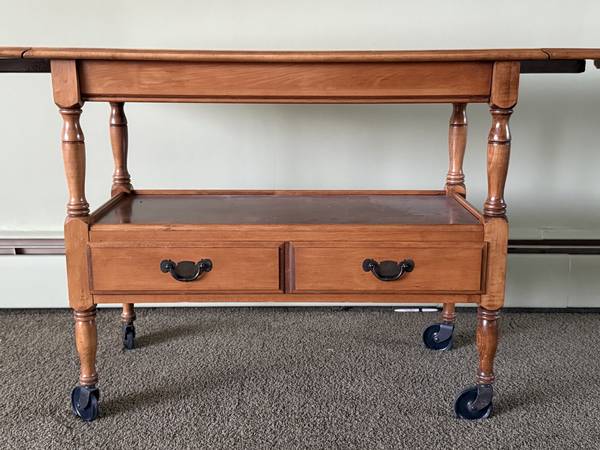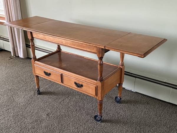 This vintage bar cart is made of solid maple by Crawford Furniture! It has a great-looking design that is very functional; it has a beautiful maple finish. This vintage bar cart has a drop leaf on each side and a lower shelf for additional storage/display shelf. It has a dovetail-notched drawer for plenty of storage. It is on wheels for easy moving, and it is finished on all sides, so it can be used in an open space. This buffet is very solid and well made and is in good condition with only minor wear on the finish (see pics). It measures about 36" wide (leaf down), 58.75" wide (leaves up), 28.75" tall, and 17.25" deep.