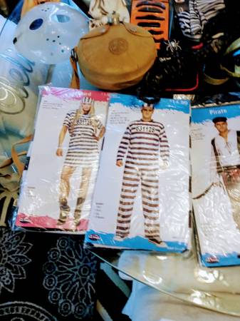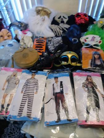 I'M SELLING A BUNDLE DEAL OF BRAND NEW HALLOWEEN COSTUMES AND MASKS FOR ALL AGES KIDS AND ADULTS MULTIPLE MASKS, FULL COSTUMES AND ACCESSORIES OVER 20 HALLOWEEN COSTUMES STORAGE TOTE INCLUDED...