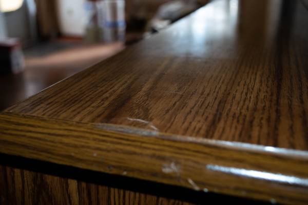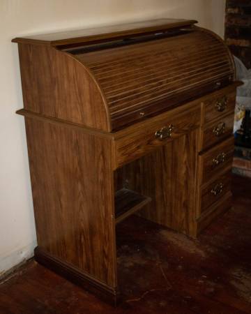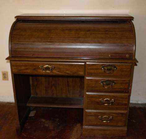 Wood veneer roll top desk. Minor scratches on desk surface. Raised bump on top right edge, as shown in photos.