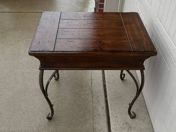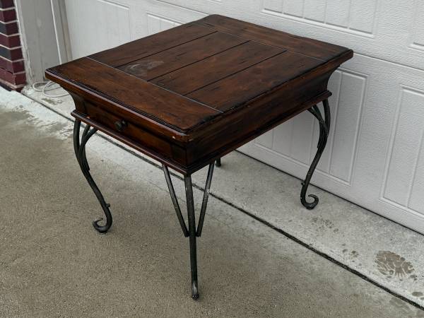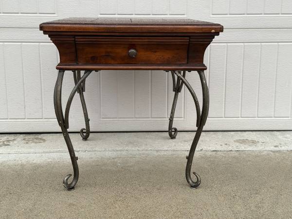 Vintage Knotty Pine End Table with Distressed Finish and Chipped Paint Metal Legs! This wood table has a great design, and it has a drawer for convenient storage. It could be used as a nightstand, end table, lamp stand, side table, or accent table. This table has a nice finish with some minor wear; it measures about 23" wide, 28" deep, 23" tall. Please see pics.