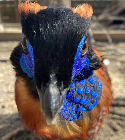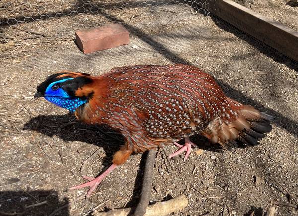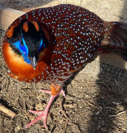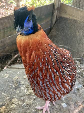 Male Temminck's Tragopan for sale. He will be 3 years old this coming spring. We're moving next year and won't be able to keep our outdoor Birds. We also have a few aviaries / enclosures available.