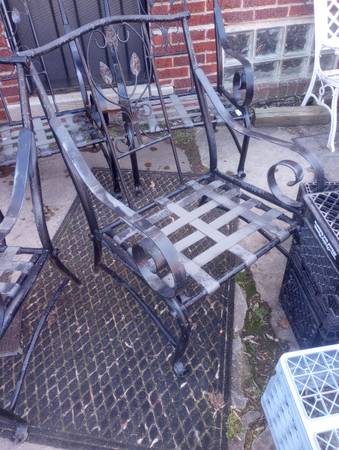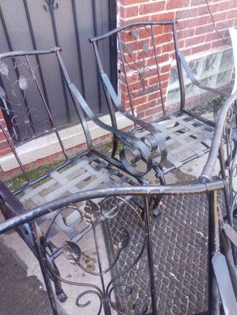 Set of 4 old heavy wrought iron chairs in great condition no cushions and a heavy old metal table has a lot of patina or re paint $250 getting all call or text to see 313407one4six8 James 7 mi...