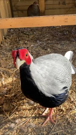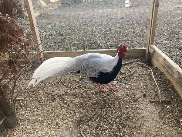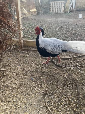 Breeding pair of Silver Pheasants for sale. They will be 3 years old this coming spring. (no pic of the hen but happy to take one, just ask). We're moving next year and won't be able to keep our outdoor Birds. We also have a few aviaries / enclosures available.