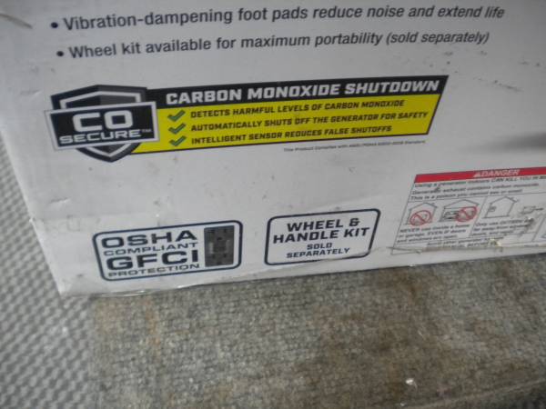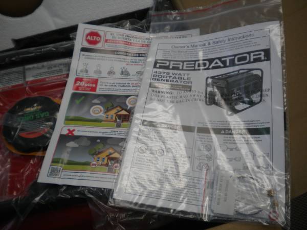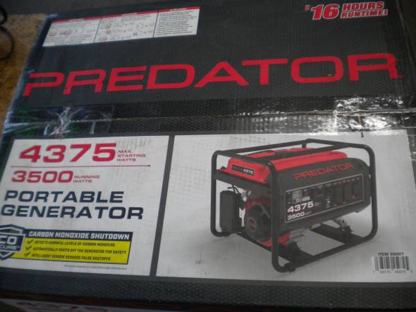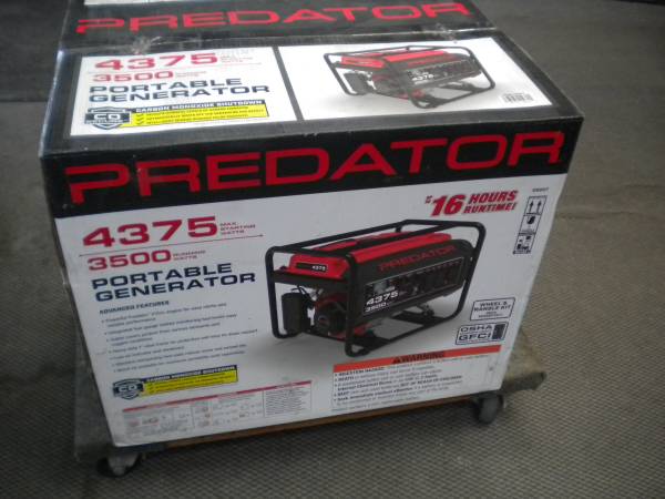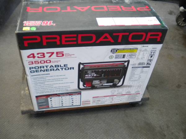 NEW PREDATOR 4375/3500 Watt Gas Powered Portable Generator with CO SECURE Technology, Never Used! Has (4) 120V GFCI protected 5-20R duplex outlets, 120/240V L14-30R twist lock outlet, 12V DC outlet. 4375 Max. Starting Watt, 3500 Max. Running Watts. Never taken out of box. WHEEL KIT AND HANDLE NOT INCLUDED, GENERATOR ONLY. Please call show contact info