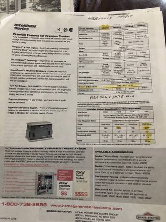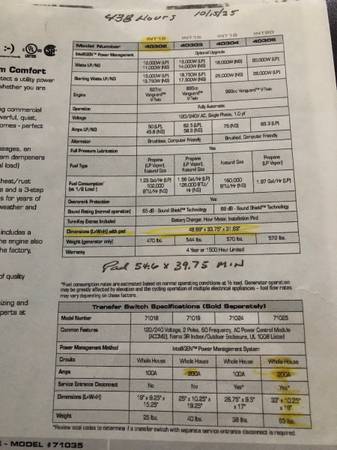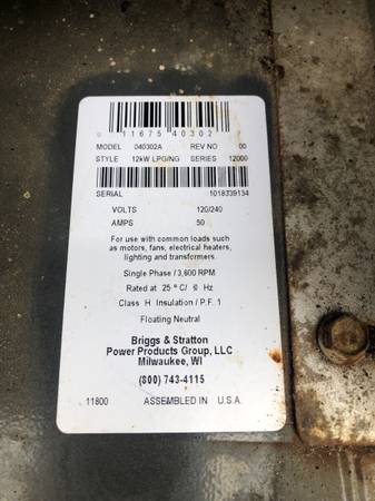 Very good condition 438 hours as of 10-15-2025 Uses natural gas or propane All specs on enclosed data tag pic and separate spec sheet pic from Briggs & Stratton Date of manufacture….November 3,...