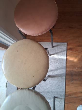 These are a set of three stools seats. They were Re covered on the top seat part with heavy vinyl material. Some staining they were used in a garage. But sturdy and in good condition still. Call/ text to confirm pick up. Cash only. Thanks