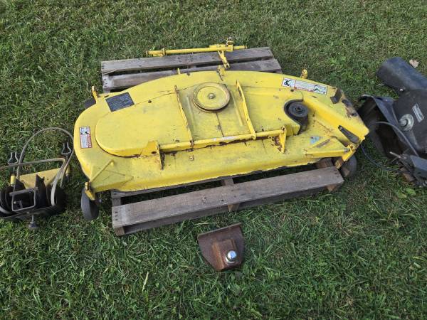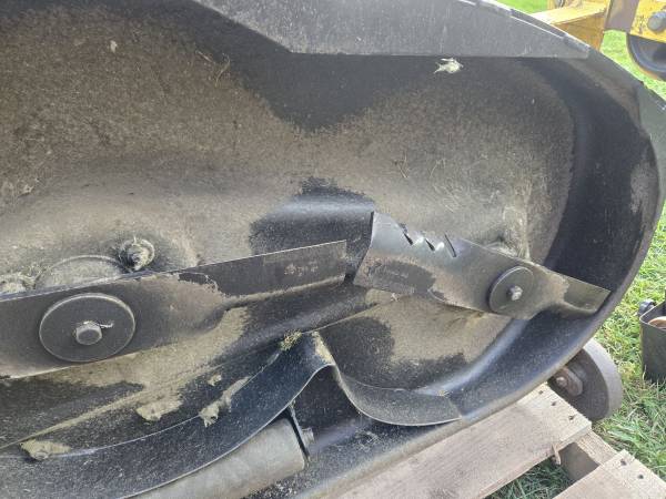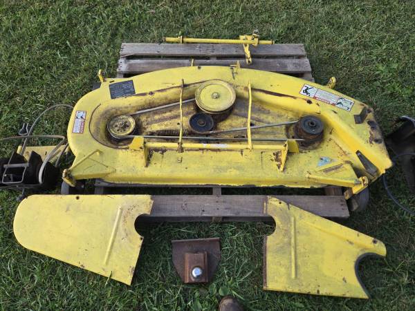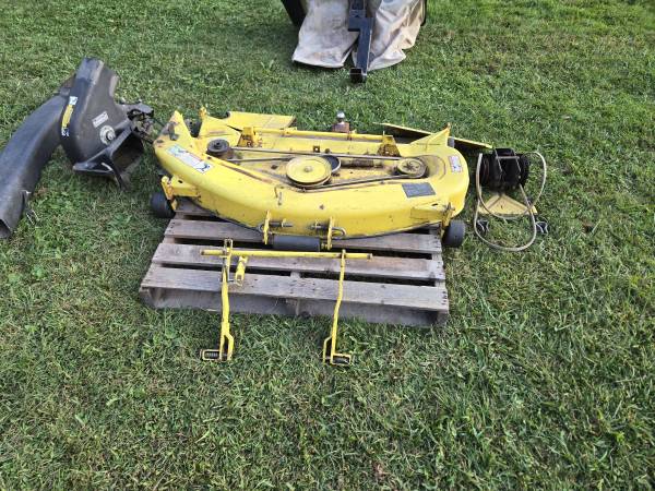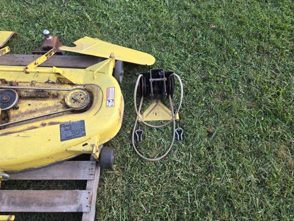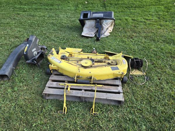 John Deere 50-inch mower deck and powerflo bagger in excellent shape. No rust holes or thin spots! Deck was power washed in the spring and 3 coats of POR15 rust proofing coating. New set of oregon G6 gator blades, maybe 2hrs on them. Paint is barely worn off them. Everything included. Mule drive and bracket for the bags. Bags are in decent shape, no holes present. New belts on the Mule drive and deck. Even have the deck belt covers and are in great shape. This deck will fit a john deere 318,322,330 and 332. I also have a set of draft arms that can be included to make this deck fit a 140,300,314,316 and 317. Spindle bearings feel good and tight as well as the powerflo bearings spin freely. All on a pallet, and I can load into your pickup bed or trailer.
