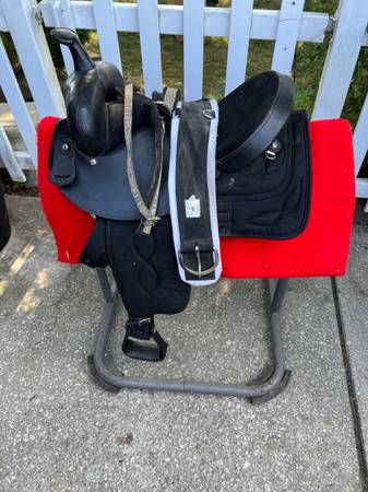 Western saddle Big Horn 16 inch seat comes with breast collar and pad. Always kept clean and covered. Very comfortable and easy to lift and carry.