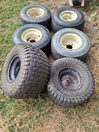 Size is pictured. Lawnmower tires are in great shape no cracks transmission went out in mower. Golf cart came off a club car. $30 takes all firm price Located in Monroe MI Call or text 734 - 819-2 THREE 76 please leave voicemail if no answer thank you