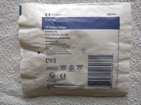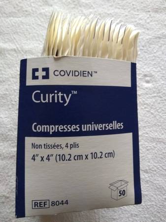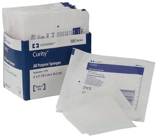 These are brand-new, unused, unopened, undamaged packages of Covidien Curity Non-Woven All Purpose Sponges 4" x 4", 4-Ply (8044). Sterile 2's. Ideal for applying ointments, prepping, wiping needles, cleaning slides and more. Rayon and polyester blend, highly absorbent and virtually lint-free. 2/PK 25PK/BX for a total of 50 sponges per box.