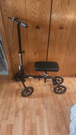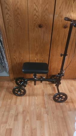 Knee scooter, compact, easy to turn and manage up and down small inside stepd, cushioned knee rest, hand brake, folds, light weight