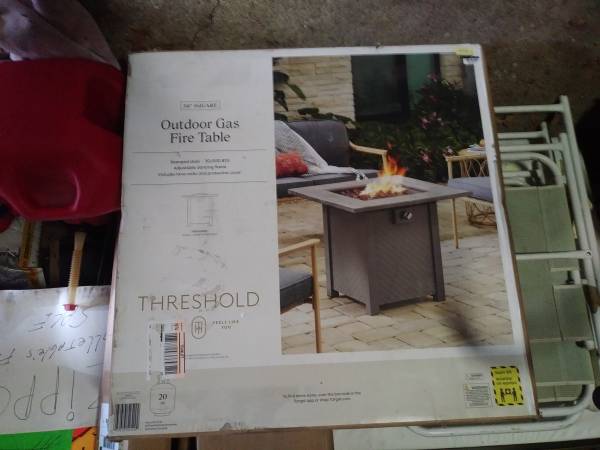 Outdoor gas fire table. 50,000 BTU. Adjustable dancing flame. Includes lava rocks and protective cover.