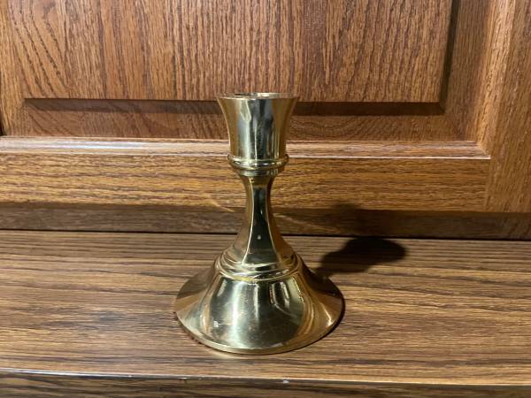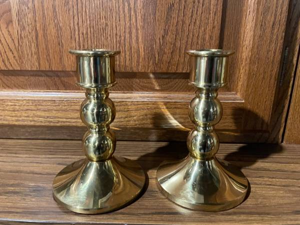 Brass candle stick holders. 2 coated brass Hallmark holders, 5” tall - $15. 1 brass holder, 11” tall - $10. 1 brass holder 4” tall - $5 All for $20. Call Doug 313655two907