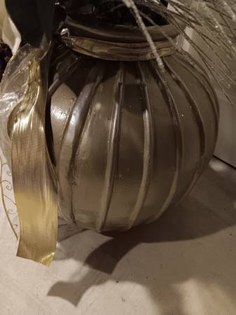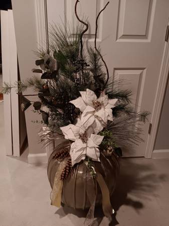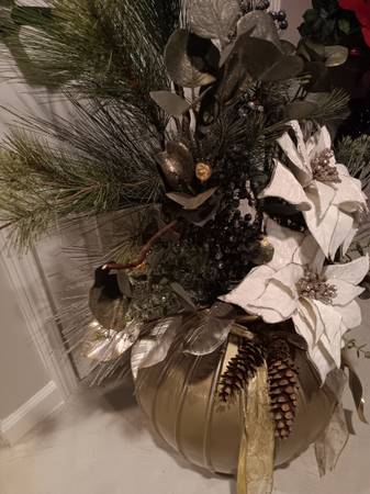 Gold round ceramic vase filled with pine cones, berries, evergreens and 2 white/gold poinsettia's. Great for your Holiday decor!!
