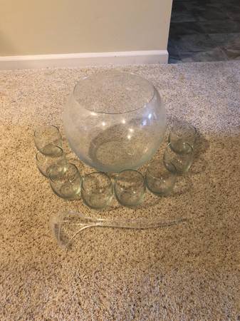 Bowl measures 10” high and 10” at its widest diameter, and holds THREE GALLONS of alcohol – I mean, healthy, fruit-filled punch – plus eight 10-ounce punch cups and one ladle. Excellent condition; only used once. Purchased from Crate & Barrel for $38.