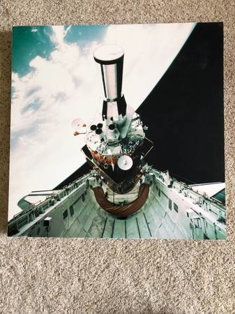 This beautiful photo measures 20” x 20”. It was taken from the ISS and is mounted on a lightweight backing, with a wooden frame on the back for hanging.
