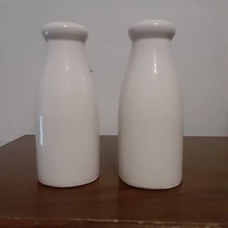 I have one pair of milk bottle salt & pepper shakers. Perfect condition-no chips, scratches or cracks on either one of them. The two rubber stoppers on bottom of each shaker are in mint condition. Approx. 4 1/2 inches high. $3.00 for the pair. Call or text show contact info