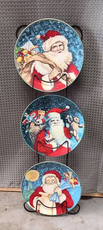 A must-have for Santa lovers. Three 8.25" plates depicting Santa bringing a bag full of toys, on a decorative black wall-hanging display rack. Never hung. Still in the original box with original...