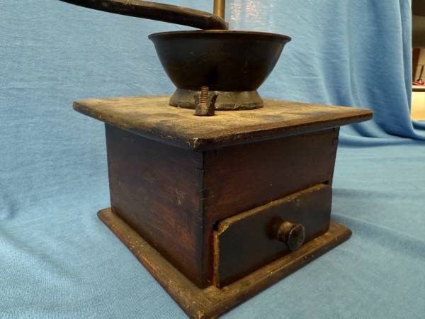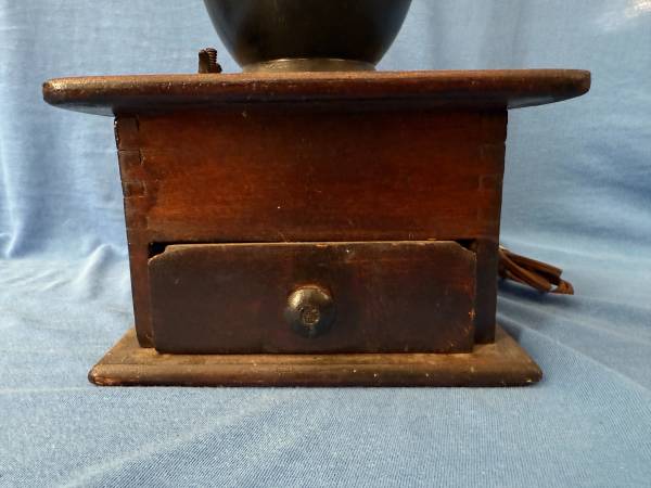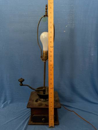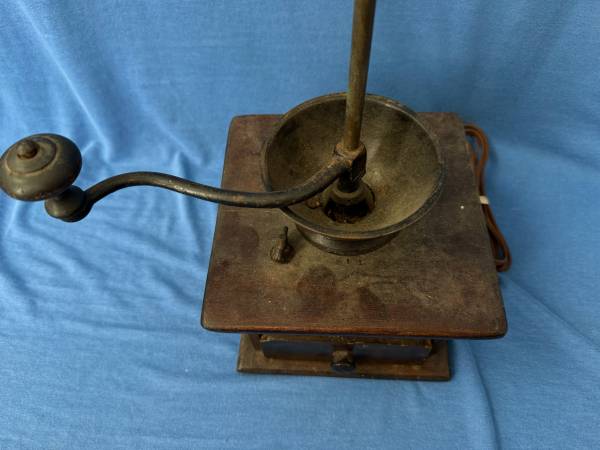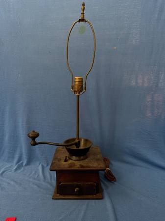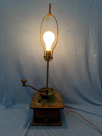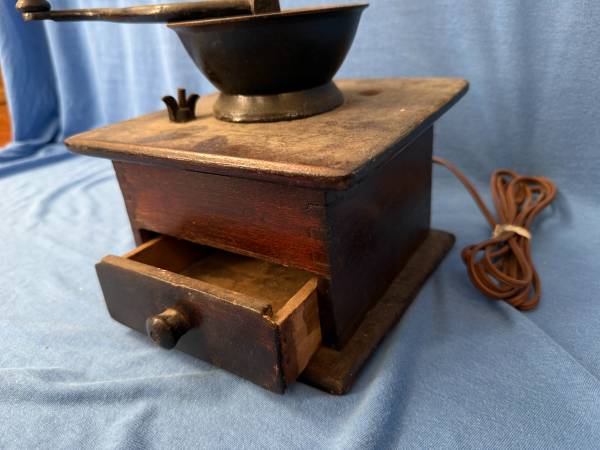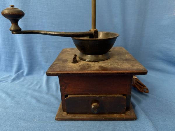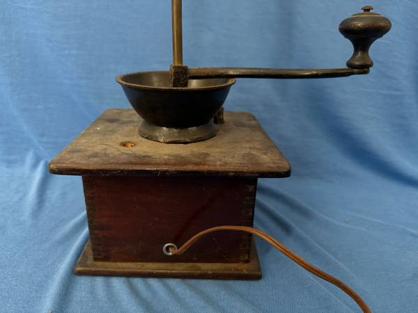 Antique Coffee Grinder made into a Table Lamp! This vintage lamp has a coffee grinder with the original drawer, rotating grinding arm, and metal bowl for the coffee beans. The grinder box is made of old growth hardwood, and it has dovetail notched corners. The light works, and the shaft is loose; it does not come with a shade. This lamp measures about 26.5” tall (from the base to the top of the post); please see pics. This antique coffee grinder lamp will look great in a variety of spaces!
