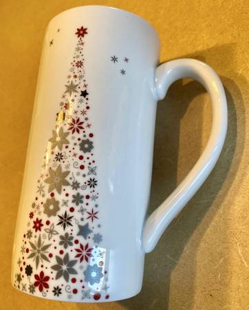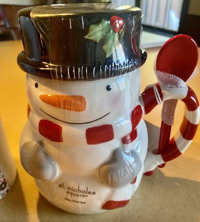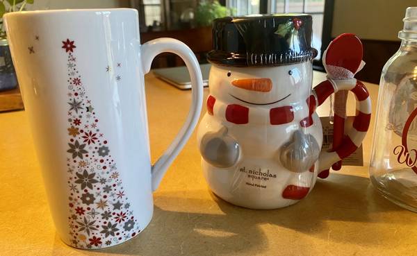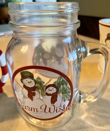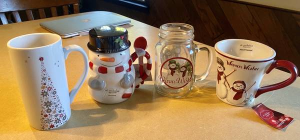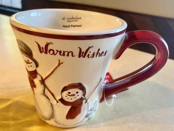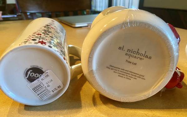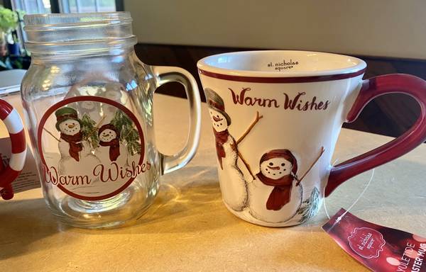 One Food Network Porcelain mug, two St Nicholas hand Painted mugs, one mason mug, all new